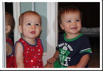 After all that beach fun, it was back to the condo for some naps. When they woke up, they found their new favorite toy…MIRRORS! They loved sitting at the huge hall mirrors and patting at themselves. Parker especially loved this…it was hillarious, he would look at himself real close, then give his mirror self a big smacker kiss. Precious. Tristan was more interested in the cameras we were using to snap so many pics, my techno boy! Parker and Tristan did such a great job playing together, they had the best time sharing toys, phones and crawling all over the place! Sweet boys.